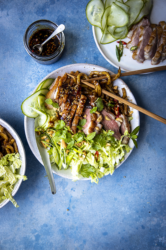 Duck Noodle Cucumber Salad Bowl might sound tricky for a mid-week option, but duck breasts are easy to cook if you score the skin and start it in a cold pan, it renders out like magic. The sauce does the heavy lifting here: sticky, sweet, salty and spiked with chilli. Toss your noodles in that punchy dressing, pile on crisp cabbage and scallions, and don’t skimp on the herbs and peanuts at the end. It’s big on contrast- hot duck, cold veg, chewy noodles, crunchy toppings, a simple family favourite.