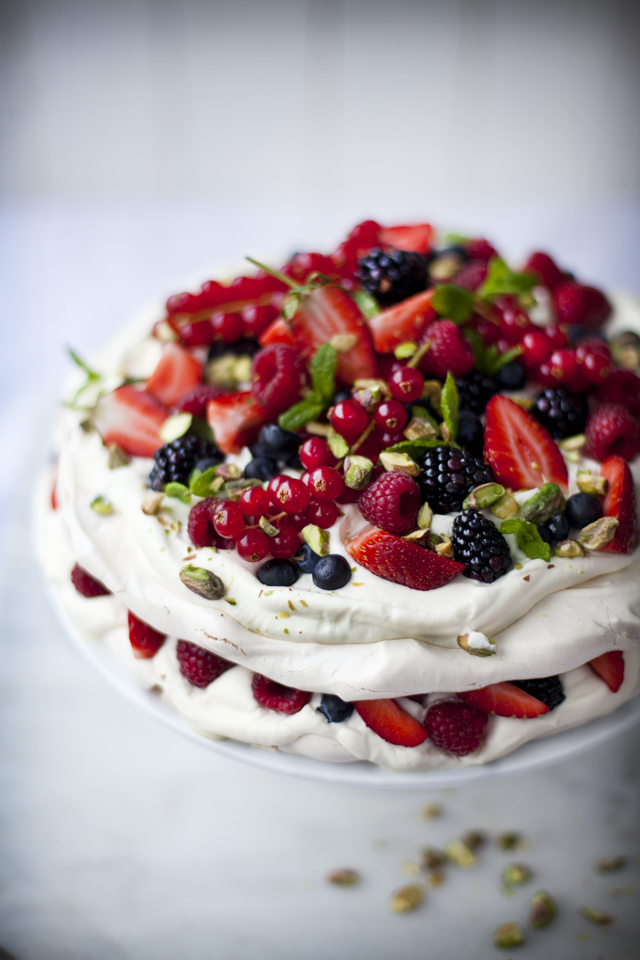 Lastly, the summer dessert I was brought up on, a berry pavlova. My aunt Erica is the master of pavlova’s and along with her lemon slices it’s most likely her most requested recipe! Her version is possibly one of the most easy to make, as it uses icing sugar and egg whites whipped on high for ten minutes, before folding through cornflour and white wine vinegar for the ultimate crispy shell and marshmallow interior. It negates the need to slowly add the sugar and the risk of having a grainy pavlova base. Top it with copious amounts of whipped cream and whatever berries you’re having and it will be devoured in minutes.