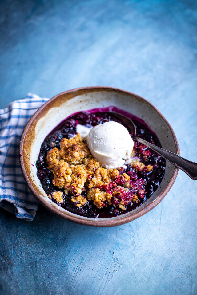 This Blueberry & Oat Crumble is the one I come back to time and time again. It’s buttery and has bite to it rather than the sandy breadcrumbs of the crumbles of my childhood. Use it with any of the summer’s bounty and adapt it with flavour enhancers like lemon or orange zest, spices like cardamom and cinnamon or additional ingredients like desiccated coconut.
